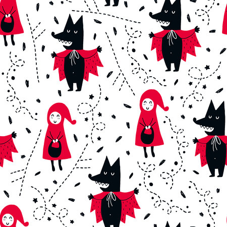 おとぎ話かわいいシームレスなパターン カラーベクトルの背景 女の子とオオカミとのイラスト Tシャツ テキスタイル プリントのデザイン のイラスト素材 ベクタ Image